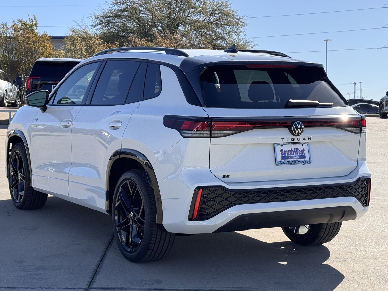 This 2026 Volkswagen Tiguan 2.0T SE R-Line Black in Opal White Pearl comes with the following features: 2.0L TSI DOHC 8-Speed Automatic FWD 18 Alloy wheels, 4-Wheel Disc Brakes, 4-Wheel Independent Suspension, 7 Speakers, ABS brakes, Air Conditioning, AM/FM radio: SiriusXM with 360L, Auto High-beam Headlights, Auto-dimming Rear-View mirror, Automatic temperature control, Brake assist, Bumpers: body-color, Compass, Delay-off headlights, Driver door bin, Driver vanity mirror, Dual front impact airbags, Dual front side impact airbags, Electronic Stability Control, Emergency communication system, Exterior Parking Camera Rear, Four wheel independent suspension, Front anti-roll bar, Front Bucket Seats, Front Center Armrest, Front dual zone A/C, Front reading lights, Fully automatic headlights, Heads-Up Display, Heated door mirrors, Heated Front Seats, Heated front seats, Illuminated entry, Knee airbag, Leather Shift Knob, Leather steering wheel, Low tire pressure warning, Occupant sensing airbag, Outside temperature display, Overhead airbag, Overhead console, Panic alarm, Passenger door bin, Passenger vanity mirror, Perforated V-Tex Leatherette Seating Surfaces, Power door mirrors, Power driver seat, Power Liftgate, Power moonroof: Panoramic, Power steering, Power windows, Radio data system, Radio: MIB4 Composition Media Touchscreen with AM/FM, Rain sensing wipers, Rear anti-roll bar, Rear reading lights, Rear seat center armrest, Rear side impact airbag, Rear window defroster, Rear window wiper, Remote keyless entry, Security system, Speed control, Speed-sensing steering, Split folding rear seat, Spoiler, Sport steering wheel, Steering wheel mounted audio controls, Tachometer, Telescoping steering wheel, Tilt steering wheel, Traction control, Trip computer, Turn signal indicator mirrors, Variably intermittent wipers, and Wheels: 20 Black Painted Alloy.