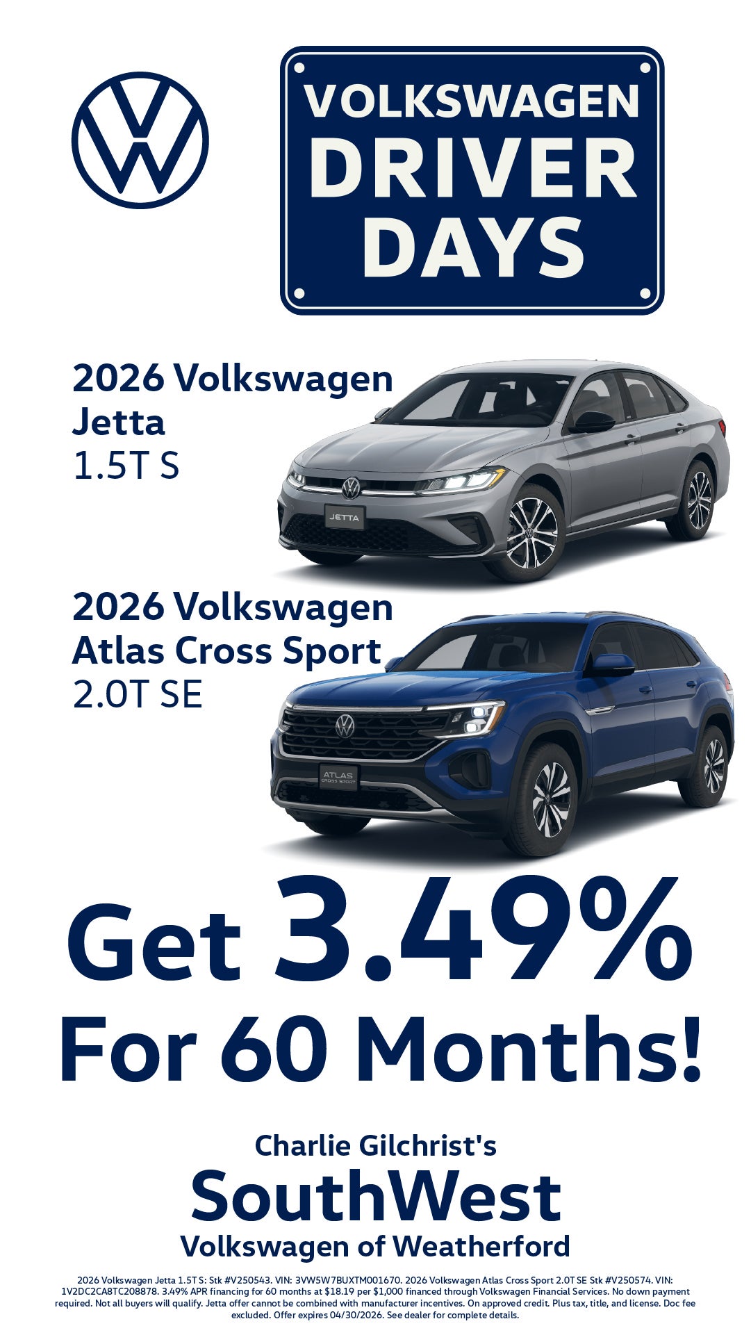 Get 3.49% For 60 Months! show and label: 2026 Volkswagen Jetta 1.5T S and 2026 Volkswagen Atlas Cross Sport 2.0T SE https://www.southwestvolkswagen.com/new-Weatherford-2026-Volkswagen-Jetta-15T+S-3VW5W7BUXTM001670 2026 Volkswagen Jetta 1.5T S: Stk #V250543. VIN: 3VW5W7BUXTM001670. 026 Volkswagen Atlas Cross Sport 2.0T SE Stk #V250574. VIN: 1V2DC2CA8TC208878. 3.49% APR financing for 60 months at $18.19 per $1,000 financed through Volkswagen Financial Services. No down payment required. Not all buyers will qualify. Jetta offer cannot be combined with manufacturer incentives. On approved credit. Plus tax, title, and license. Doc fee excluded. Offer expires 04/30/2026. See dealer for complete details.