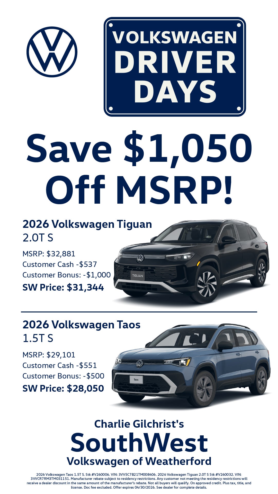show and label 2026 VW Tiguan 2.0T S and Taos 1.5T S Save $1,050 Off Msrp Offer 1 details 2026 Volkswagen Tiguan 2.0T S https://www.southwestvolkswagen.com/new-Weatherford-2026-Volkswagen-Tiguan-20T+S-3VVCR7RM3TM031151 MSRP: $32,881 Customer Cash -$537 Customer Bonus: -$1,000 SW Price: $31,344 Offer 2 - 2026 Volkswagen Taos 1.5T S https://www.southwestvolkswagen.com/new-Weatherford-2026-Volkswagen-Taos-15T+S-3VV5C7B21TM008406 MSRP: $29,101 Customer Cash -$551 Customer Bonus: -$500 SW Price: $28,050 Disclaimer:2026 Volkswagen Taos 1.5T S. Stk #V260006. VIN: 3VV5C7B21TM008406. 2026 Volkswagen Tiguan 2.0T S Stk #V260032. VIN: 3VVCR7RM3TM031151. Manufacturer rebate subject to residency restrictions. Not all buyers will qualify. On approved credit. Plus tax, title, and license. Doc fee excluded. Offer expires 04/30/2026. See dealer for complete details.