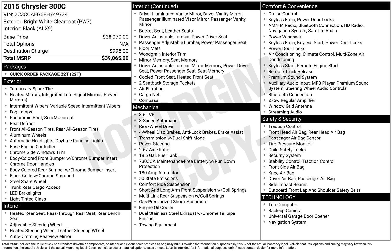 The 2015 Chrysler 300C delivers a refined driving experience with bold full-size sedan styling, smooth performance, and upscale comfort. Designed to balance luxury and power, this rear-wheel-drive sedan offers a confident ride with premium features throughout.