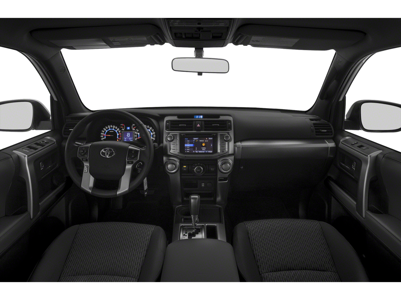 This 2019 Toyota 4Runner SR5 in Black comes with the following features: 4.0L V6 SMPI DOHC 5-Speed Automatic with Overdrive RWD Black Graphite w/Fabric Seat Trim, 17 x 7.0 6-Spoke Alloy Wheels, 3.727 Axle Ratio, 4-Wheel Disc Brakes, 8 Speakers, ABS brakes, Air Conditioning, Alloy wheels, AM/FM radio: SiriusXM, Anti-whiplash front head restraints, Brake assist, Bumpers: body-color, CD player, Driver door bin, Driver vanity mirror, Dual front impact airbags, Dual front side impact airbags, Electronic Stability Control, Emergency communication system: Safety Connect, Exterior Parking Camera Rear, Front anti-roll bar, Front Bucket Seats, Front Center Armrest, Front fog lights, Front reading lights, Front wheel independent suspension, Heated door mirrors, Illuminated entry, Knee airbag, Leather Shift Knob, Leather steering wheel, Low Fabric Seat Trim, Low tire pressure warning, Occupant sensing airbag, Outside temperature display, Overhead airbag, Overhead console, Panic alarm, Passenger door bin, Passenger vanity mirror, Power door mirrors, Power driver seat, Power steering, Power windows, Radio: Entune Audio Plus, Rear anti-roll bar, Rear seat center armrest, Rear window defroster, Rear window wiper, Remote keyless entry, Roof rack: rails only, Security system, Speed control, Speed-sensing steering, Split folding rear seat, Spoiler, Steering wheel mounted audio controls, Tachometer, Telescoping steering wheel, Tilt steering wheel, Traction control, Trip computer, and Variably intermittent wipers.