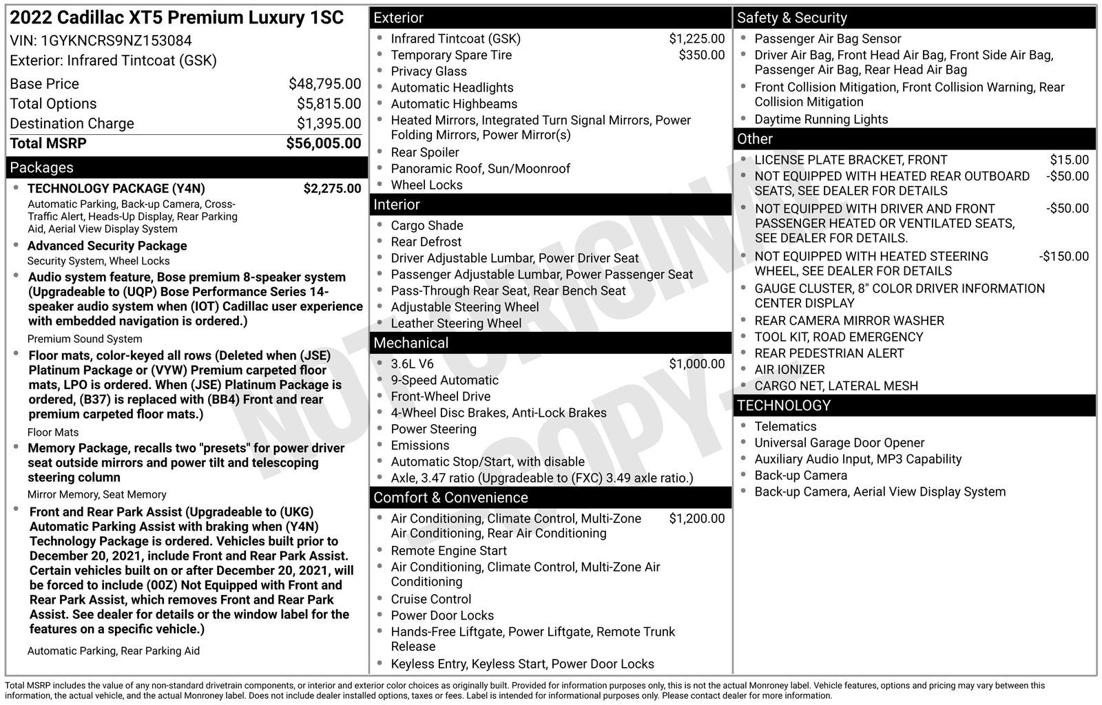 This Clean CARFAX 2022 Cadillac XT5 Premium Luxury FWD delivers refined comfort, smooth performance, and advanced safety in a stylish midsize SUV. Powered by a responsive 3.6L V6 engine paired with a 9-speed automatic transmission, the XT5 offers confident acceleration and a quiet, composed ride. Finished in Infrared Tintcoat with a Jet Black interior, this Cadillac stands out with premium design and upscale features throughout.